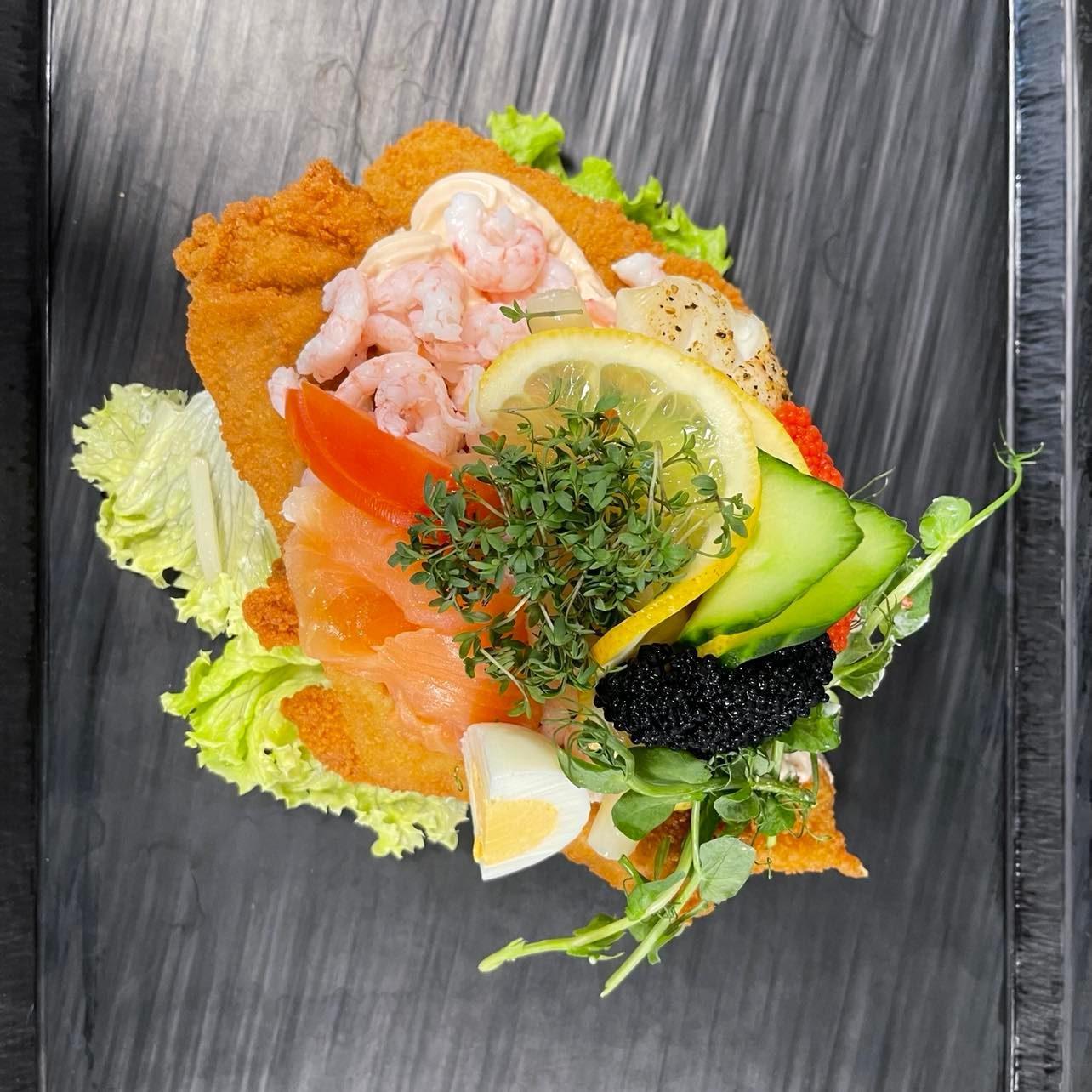 m/2 stegte rødspættefilet, rejer, laks, asparges og dressing